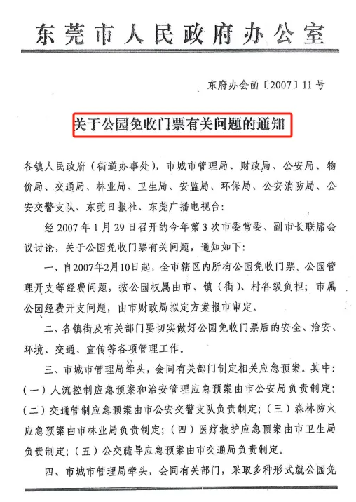 3、东莞市政府发文要求公园免收门票