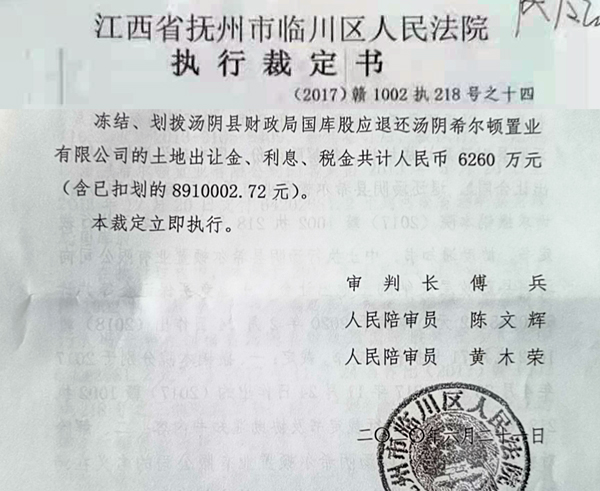 2020年6月21日,江西省抚州市临川区人民法院作出(2017)赣1002执218号之十四执行裁定书,冻结、划拨汤阴县财政局国库股应退还汤阴希尔顿置业有限公司的土地出让金、利息、税金共计人民币6260万元(含已划拨的8910002.72元),裁定立即执行。