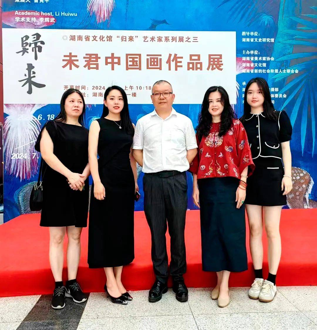中共湖南省委统战部原副部长龙建湘,湖南省工商联党组成员、副主席彭天忠,湖南省文史馆副馆长赵为济,湖南省文联二级巡视员谢群,湖南省文联副主席、省美协主席旷小津,九三学社湖南省委会原二级巡视员刘福全,湖南省美协原副主席,湖南大学教授、博士生导师陈飞虎,湖南省新阶联主席陈志强,湖南省新阶联副主席,《环球财经》编委一清,湖南省新阶联副主席,长沙市人力资源协会会长陈武,中共湖南省委统战部新阶处处长周围,中共湖南省委统战部新阶处二级调研员张卫山,湖南省工商联宣教部部长李超玲,湖南省文联权益保护与行业建设处处长、行业党委专职副书记谢子元,湖南省文旅厅艺术处四级调研员李国乐,中共湖南省委统战部新阶处副处长洪德意,九三学社湖南省委宣传处四级调研员、九三学社湖南省书画院秘书长黄佳佳,长沙高新区隆平高科技园区 原党委副书记吴清斌,湖南省文化馆馆长、党委书记叶伟平,湖南省企(事)业文联副主席、秘书长,《财富地理》总编赵涛,湖南省文化馆副馆长、著名书法家、教育家、收藏家曹隽平,长沙市政协常委,九三学社长沙市委会专职副主委王剑平,湖南省企业文化促进会执行会长,长沙市湘潭商会会长谢建军,湖南省美术家协会副秘书长曹先兵,九三学社中央书画院副秘书长,九三学社湖南省书画院院长邹培刚,中国诗歌学会理事、一级作家,散文诗期刊总编辑卜寸丹,全国妇女手工编织协会副会长,中国工艺美术大师江再红,岳阳市美术家协会主席、岳阳市美术馆馆长戴剑,岳阳市美术馆副馆长王伟,中国工笔画学会理事、湖南省工笔画学会副会长姜贻华,长沙市美术家协会常务副主席兼秘书长易衡卫,永州市美术家协会主席、湖南省花鸟画家协会副主席赵洪琦,张家界市美协主席,九三学社湖南省书画院副院长吕启琼,湖南省花鸟画家协会副主席郭跃,中国作协会员、益阳市作家协会主席、一级作家冯明德,中国作协会员、益阳市作家协会副主席胡跃飞,湖南师范大学美术学院教授、博士生导师姜松荣,湖南工商大学设计艺术学院党委书记、教授唐朝晖,湖南工商大学设计艺术学院副院长、教授陈旺,湖南工商大学设计艺术学院院长助理、视传系主任禹云贵,湖南文理学院美术学院教授、湖南省工笔画学会副会长漆跃辉,长沙师范学院党政办主任刘平,长沙师范学院美术与设计学院院长唐志,益阳市美术家协会党支部书记林克俭,岳阳楼书画院院长、九三学社湖南省书画院副院长许双成,九三学社湖南省书画院副院长唐风,逸点艺术机构总监、著名策展人刘晨,湖南省美协民族艺委会主任、省青年美协副主席贾文广,湖南省美协策展委员会副秘书长、省博物馆策展人王恩超,湖南省网络作家协会主席团委员施俊杰,长沙市开福区美术家协会主席代碧武,长沙市湘江新区美术家协会副主席邓立辉,益阳市资阳区美术家协会副主席邓正猷,长沙铁路收藏家协会主席崔建平,湖南鹏程能源科技有限公司总经理彭继,湖南省官新高速公路建设开发有限公司原书记方强志,湖南省圆点美术馆创始人、著名画家张健,湖南省圆点美术馆党支部书记程宜,湖南省圆点美术馆执行馆长徐华,深圳岭南书画艺术馆馆长陈冬璐,湖南省广东商会副会长侯少芳,湖南喜鹊田园文旅有限公司创始人雷洛,湖南沅陵大曲酒业有限公司总监何青龙,贵州赛台酒业集团董事长熊凤祥。还有从江西、深圳赶过来的未君老师的学生,以及本次展览的赞助单位深圳市岭南书画艺术馆,湖南沅陵大曲酒业有限公司的有关人员。