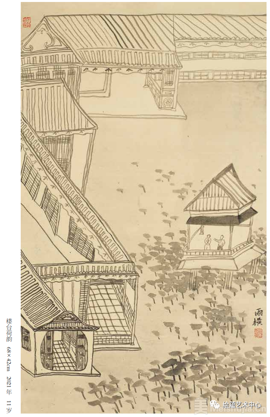池雨横2010年出生于香港,在校期间得到了王益明、陈旭两位老师的指导教育,近两年又经常去国家画院和中国艺术研究院及中央美院附中,耳提面命于龙瑞、袁学君、杜浩、戴幼楠及孙伟、畅世博诸位先生,使他的作品又有了一个质的飞跃。他钟爱书法与国画,特别是篆行两种书体和《芥子园画谱》,进行了全面系统的临摹,练就了一手过硬的功夫,对骨法用笔,应物象形,经营位置,随类赋彩等等都有了很好的理解。贝蒂.爱德华曾说:“成年学生在绘画的初级阶段并没有真正看到他们眼前的东西,也就是说,他们没有按照绘画所必需的特殊方法感知事物,这个阶段的学生,大多用动漫手法不厌其烦的刻画形象细部,毫无艺术性可言。”而池雨横的学习及感悟力极强,他能够从身边的社会、自然中寻找素材,从前辈的笔墨技巧里寻找灵感,在一步步进入艺术殿堂的同时,体验着临摹学习所带来的愉快情感。